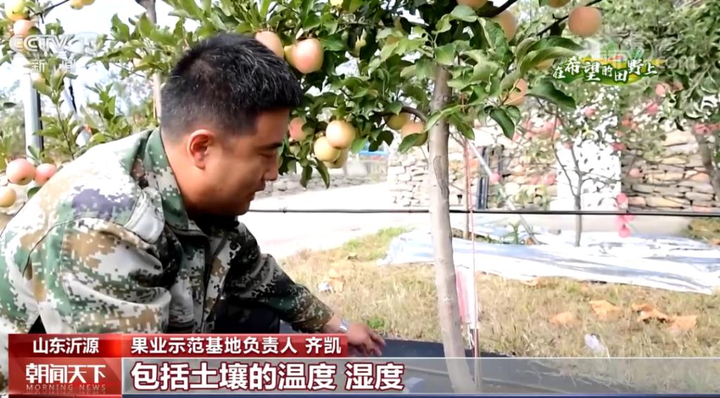 果业示范基地负责人 齐凯:这个是咱的传感器,它能够实时检测咱土壤的数据,包括土壤的温度,湿度,还有肥率值的情况,给我们传输一个最精准的数据。