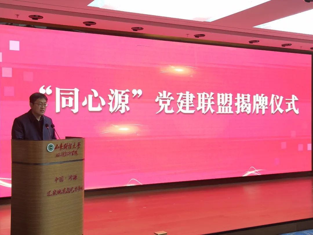 随后,范晓琨一行来到山东财经大学乡村振兴学院举行“同心源”党建联盟揭牌仪式。山东财经大学乡村振兴学院院长董方军,钢城区区委常委、区委组织部部长范晓琨分别致辞。