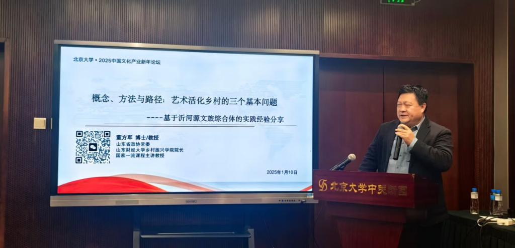 1月11日,北京大学第22届中国文化产业新年论坛在北京大学举行,本届论坛以“新高峰:中华文化与强国建设”为主题,聚焦如何通过文化治理能力的提升、文化与科技融合、文化人才队伍建设等路径,发展新时代中国特色社会主义文化,推动中华文化面向现代化、面向世界、面向未来的全面发展。我院院长董方军作为主讲嘉宾发表了题为“概念、方法与路径:艺术活化乡村的三个基本问题——基于沂河源田园综合体的实践经验分析”的主旨演讲。