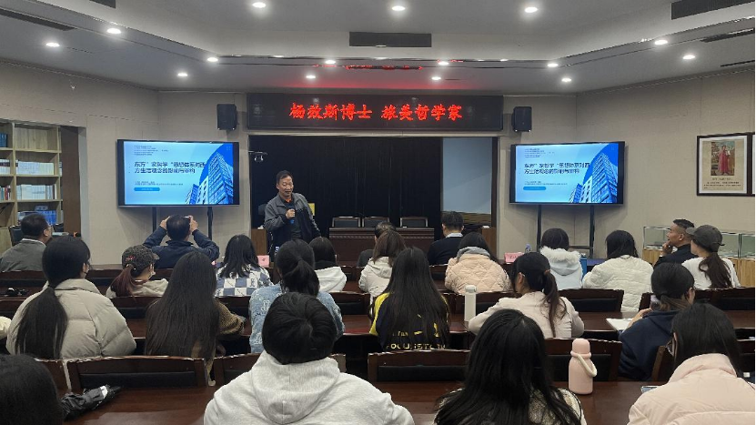 2025年10月30日下午,美国霍普金斯大学博士、旅美哲学家、“家哲学”创始人杨效斯教授应邀为我院师生开展题为《东方‘家哲学’思想体系对西方生活观念的影响与重构》的学术讲座。本次讲座由我校国际交流与合作处、文学与新闻传播学院、乡村振兴学院、孔子学堂和中国国际创意产业研究院联合举办。文学与新闻传播学院党委书记杜啸尘、孔子学堂专家们和文学院2023级在校生等80余名师生参加学术讲座。本次学术讲座由文学与新闻传播学院党委书记杜啸尘主持。