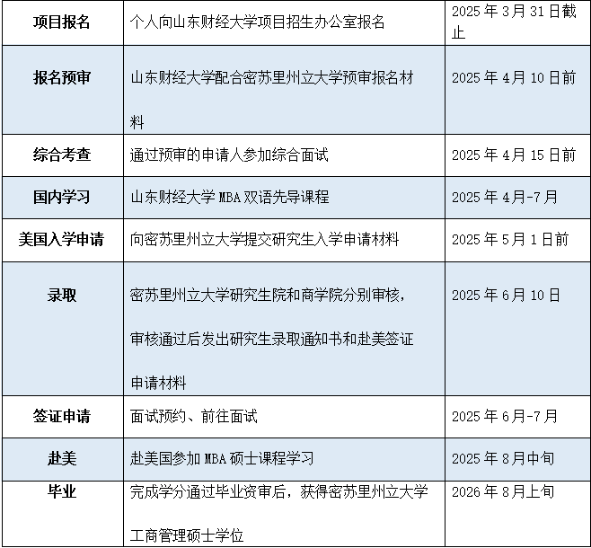 山东财经大学和美国密苏里州立大学(Missouri State University)是长期合作院校,多年合作开展MBA项目。学生在山东财经大学经过3个月的MBA双语先修课程学习后,赴美学习一年,成绩合格者将获得中国教育部学位学历认证的密苏里州立大学工商管理硕士(MBA)学位和海外留学归国人员身份。山东财经大学是密苏里州立大学在山东唯一合作大学。