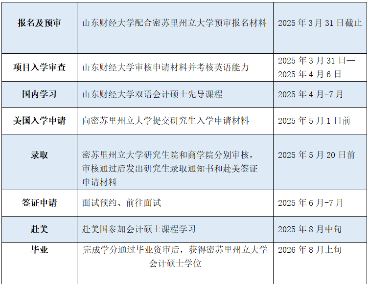 2.根据美国密苏里州立大学会计硕士学位的学术标准要求,学生首先在山东财经大学通过线下(或线上)完成3个月的会计硕士先修课程学习,然后赴美学习12个月,完成10门会计硕士学位课程。